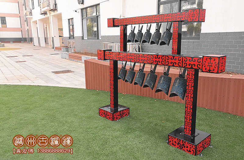 編鐘外形按照曾侯乙編鐘制作,青銅鑄造;采用標(biāo)準(zhǔn)音高A=440Hz調(diào)音,要求聲音清脆悅耳,有延續(xù)音,無啞音編鐘,半音齊備,音位表詳見設(shè)計(jì)圖,編鐘采用雙層設(shè)計(jì),下層懸掛6件甬鐘,上層懸掛5件甬鐘。編鐘大梁采用鋼結(jié)構(gòu)焊接制作,表面噴漆,彩繪花紋,設(shè)計(jì)詳見合同附件。配套演奏工具1套、樂譜1套。