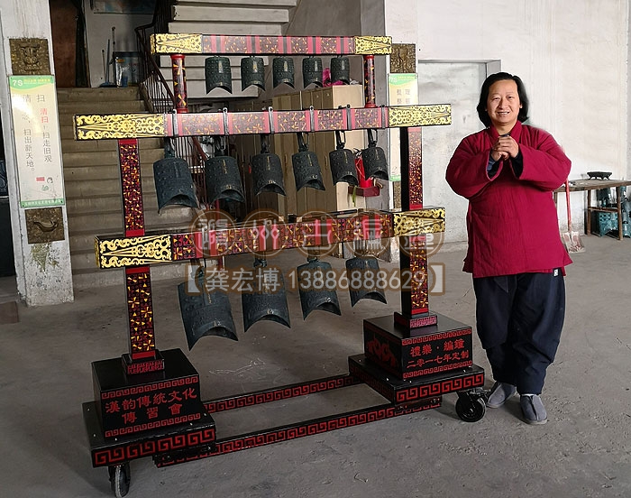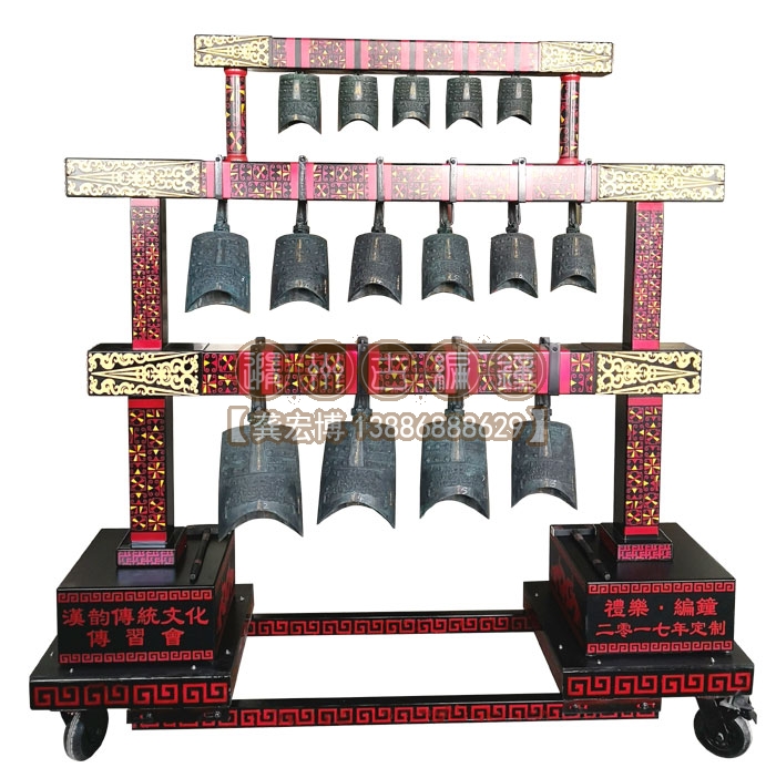 合肥漢韻文化傳習(xí)會定制的15件3層編鐘長1.9米、高1.86米、寬0.5米,音律齊全,演奏使用方便,木架上可以彩繪客戶定制文字或圖案,底部安裝鋼制滑輪,安裝移動都非常方便,配有樂器標準航空箱,外出表演得心應(yīng)手。