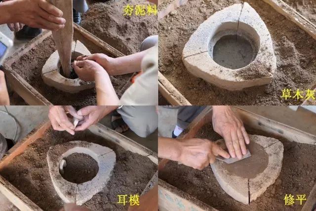 接著夯泥料至口沿處,這時需將事先準(zhǔn)備好的耳模安置在口沿處,接著夯制,直至夯滿芯盒。貼泥制芯既得到壁厚,也產(chǎn)生了泥芯,可謂一舉兩得。