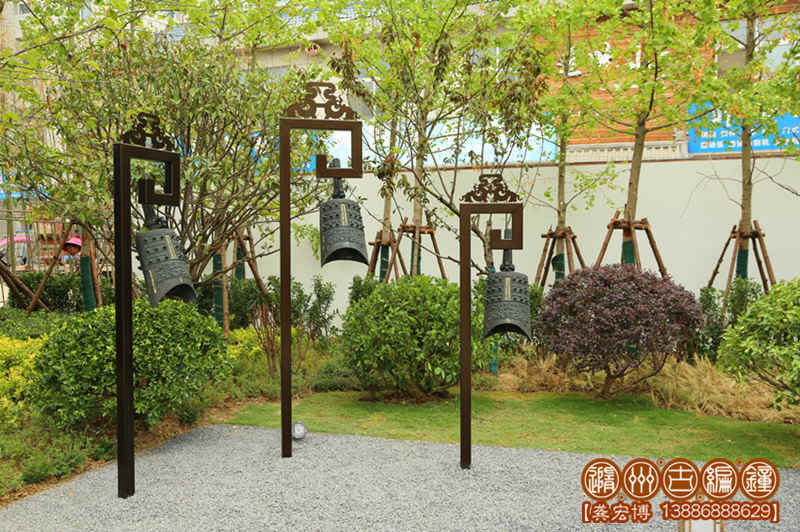 青銅古鎮(zhèn)文化雕塑——鐘柱,一組共3件,高低錯落排列,懸掛3件編鐘均可發(fā)音。