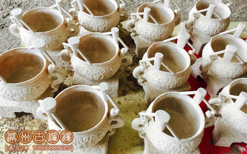 為了保證紋飾的清晰,第一層的面料我們使用硅溶膠進(jìn)行制作,硅溶膠是一種稀有的貴重精細(xì)制作材料,這種材料耐火度非常高,表層變形小,可以得到較好的編鐘表面質(zhì)量。